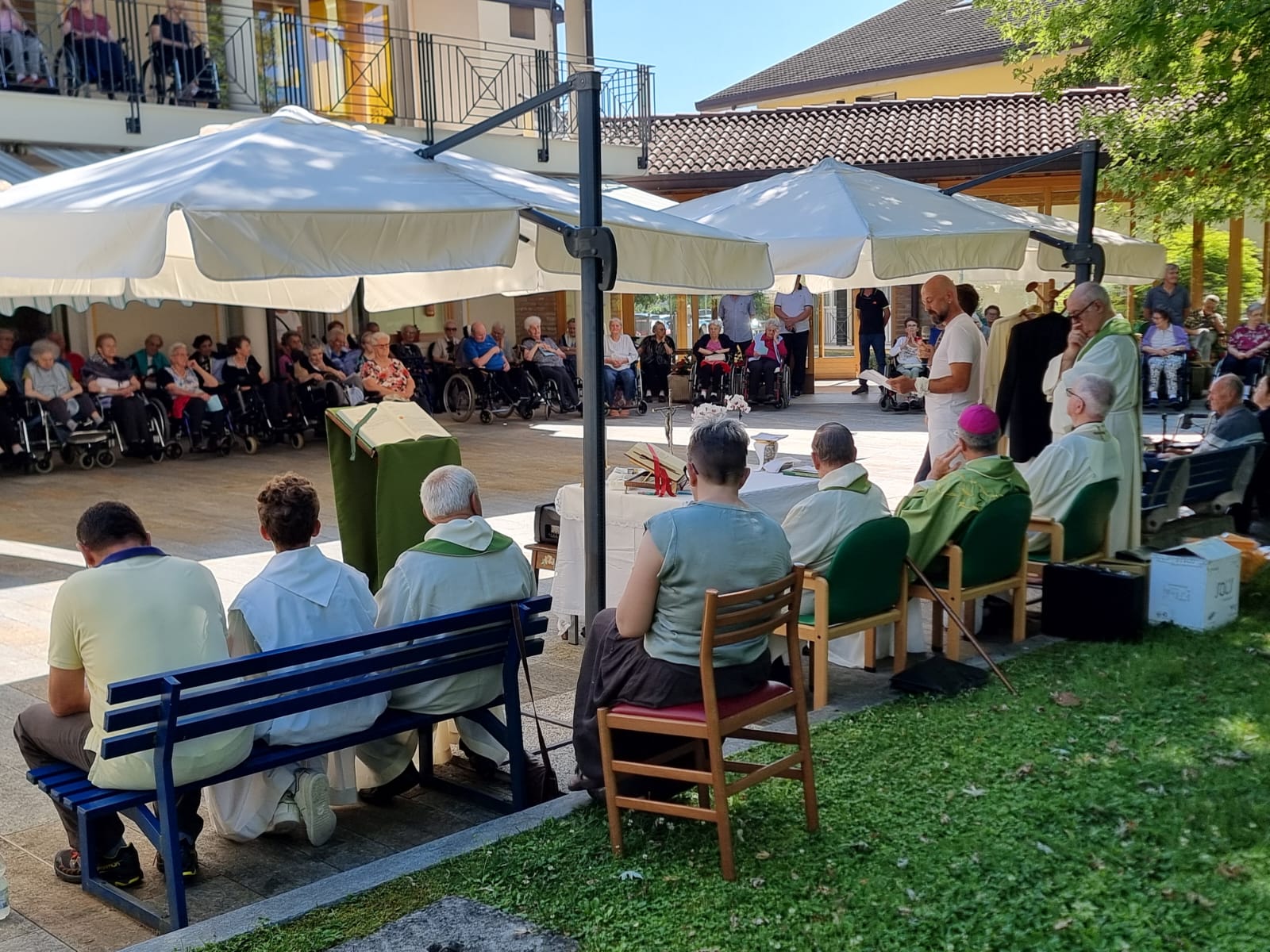 Alcuni ospiti della casa di riposo hanno accompagnato il vescovo Renato Marangoni in una processione che, partendo dall’interno della struttura, è terminata nel giardino dove si è svolta la celebrazione, presieduta dal Vescovo con tutti i sacerdoti delle comunità sorelle di Santa Giustina, San Gregorio e Paderno, con l’accompagnamento di due cori.