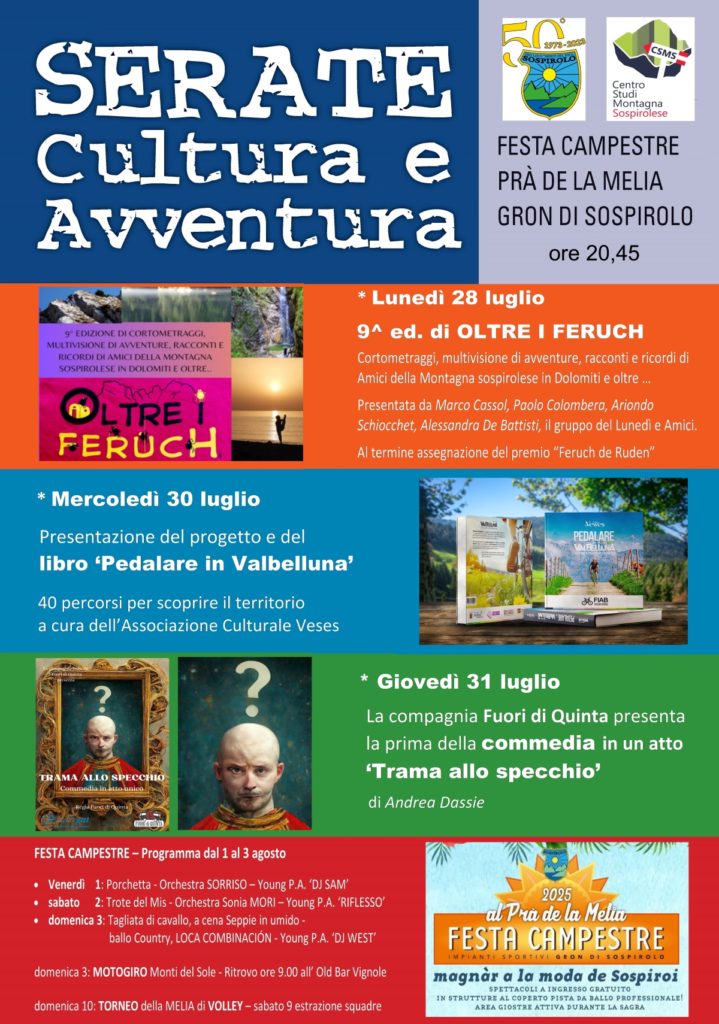 La Pro Loco Monti del Sole offre a cittadini e ospiti di Sospirolo una nuova edizione di “Cultura e Avventura”, un ciclo di appuntamenti culturali. Le serate, che si terranno al centro ricreativo “Prà de la Melia”, rappresentano il consueto preludio alla Festa Campestre del primo weekend di agosto. Il programma si apre lunedì 28 luglio e prevede tre serate, con ingresso libero, dedicate alla montagna, alla bicicletta e al teatro.