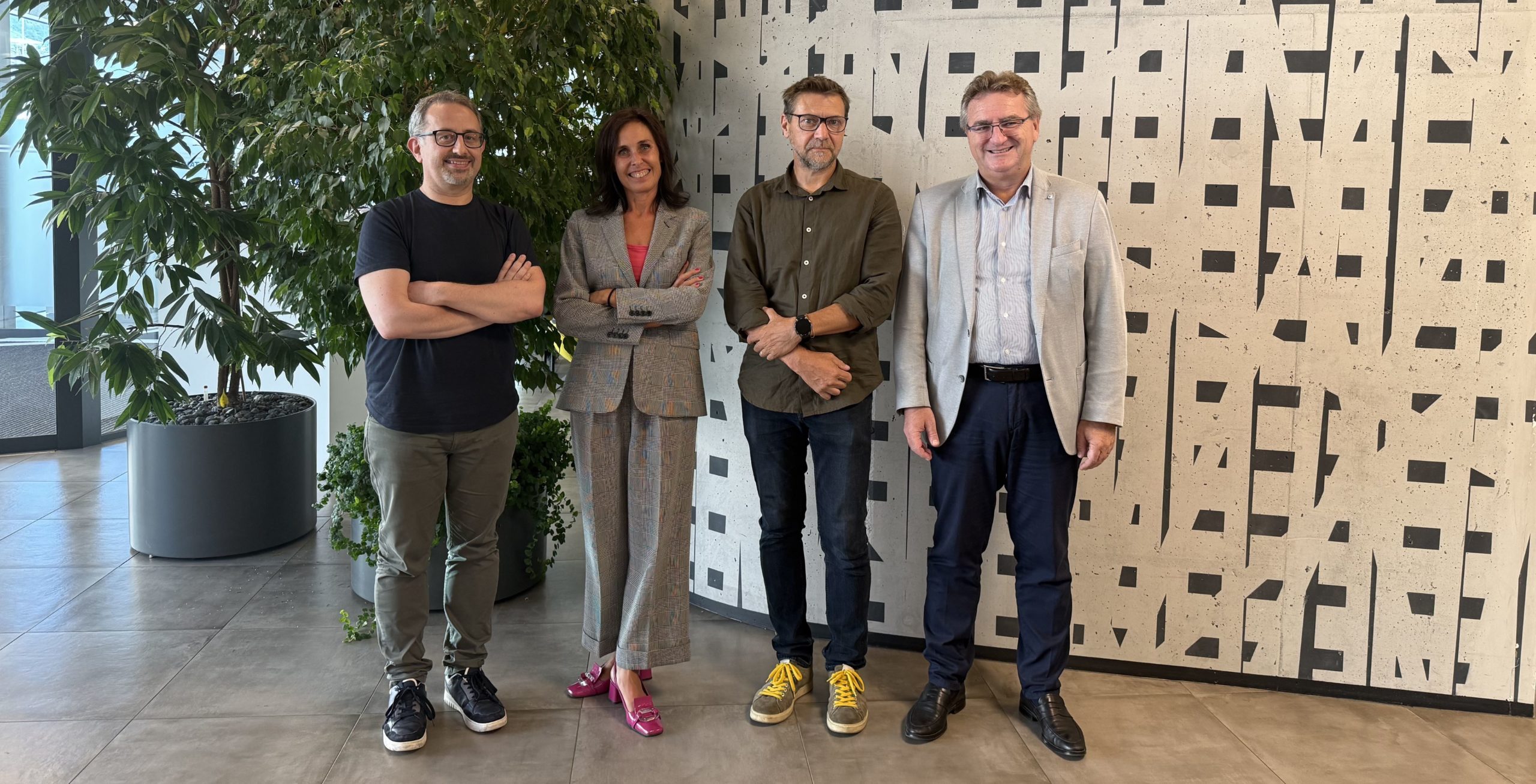 Il veicolo con motore elettrico sarà impiegato per il trasporto solidale di persone con disabilità. Nella foto, da sinistra: Tommaso Zampieri, direttore di Società Nuova; Manuela Miorelli, responsabile sostenibilità di Volksbank; Federico Bistrot, presidente di Società Nuova, e Alberto Naef, direttore generale di Volksbank.