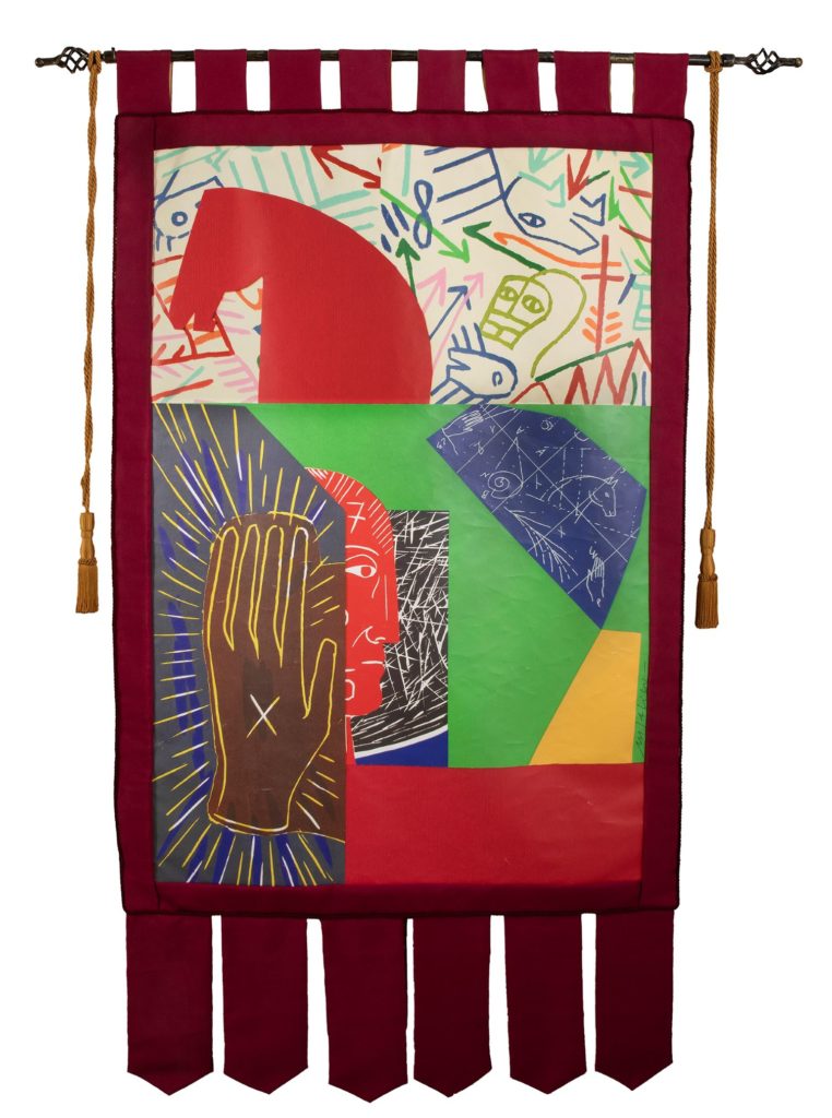 Grande attenzione anche per il drappo 2025, firmato da Mimmo Paladino, che con il suo linguaggio simbolico ha dato vita a un’opera intensa e stratificata. Caratterizzata da colori accesi e figure evocative, l’opera fonde mito, storia e spiritualità. In alto, la figura rossa di un cavallo rimanda all’iconografia del Palio e alla produzione dell’artista. In basso a sinistra, un volto e una mano alzata richiamano invece il gesto del proteggere o dell’ascoltare. Elementi astrologici, simboli religiosi e segni tribali si intrecciano in una composizione che lascia spazio a molteplici interpretazioni.