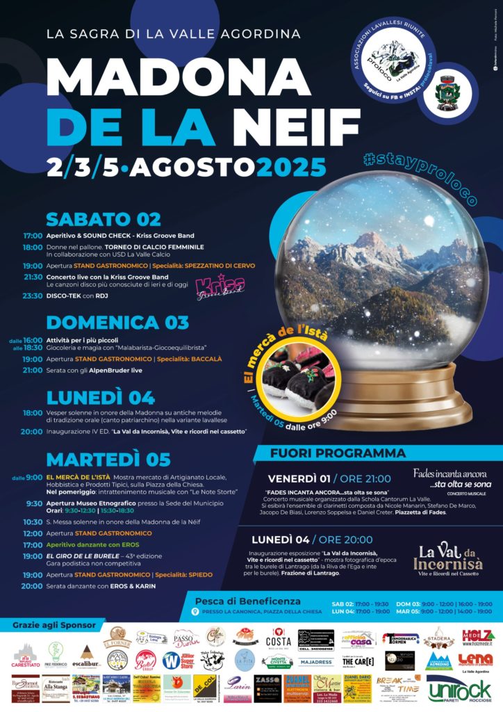 Dal 1° al 5 agosto 2025 La Valle Agordina si prepara a celebrare la tradizionale Sagra Madona de la Neif, appuntamento atteso che coinvolge l’intero paese grazie all’impegno della Pro Loco e di numerosi volontari. Un programma variegato, fatto di concerti, giochi, iniziative culturali e momenti di devozione popolare, darà vita a una festa che intreccia memoria, socialità e territorio.