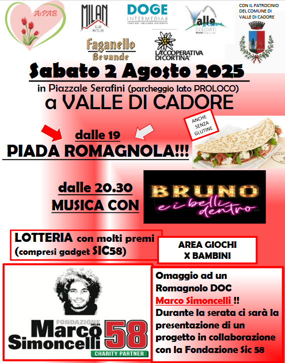 Sabato 2 agosto 2025, a partire dalle ore 19.00, negli spazi di piazzale Serafini a Valle di Cadore, è annunciato un evento dedicato alla memoria di Marco Simoncelli. L’iniziativa, organizzata dall’Associazione Parkinson Alto Bellunese, in collaborazione con la Pro Loco di Valle di Cadore e con il patrocinio del Comune, intende rendere omaggio al pilota romagnolo scomparso nel 2011 a soli 24 anni durante il Gran Premio della Malesia.