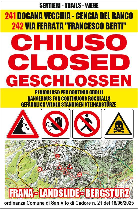 La chiusura del 242 segue quella del sentiero 241, avvenuta venerdì scorso, che da Dogana Vecchia sale sotto il fronte della frana e si collega al 242. Questa mattina sono stati installati cartelli metallici di dimensioni 60×40 centimetri ai due ingressi della Ferrata Berti, in corrispondenza del Rifugio Vandelli e del Bivacco Slataper. Quattro operatori del Soccorso alpino di San Vito e Cortina, trasportati in quota con l’elicottero regionale, hanno fissato i cartelli a strutture metalliche che impediscono il passaggio e rendono evidente la chiusura. L’operazione è avvenuta in coordinamento con la Protezione civile.