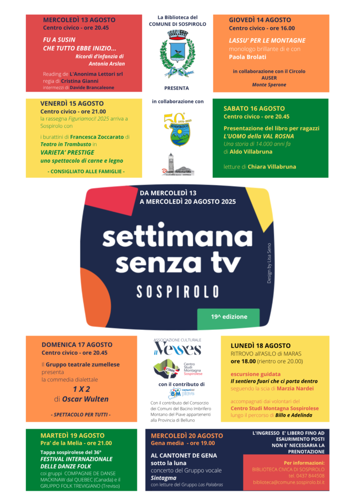 Torna anche quest’anno la “Settimana senza Tv”, iniziativa promossa dal Comune di Sospirolo con il Comitato di Biblioteca e diverse associazioni locali. Dal 13 al 20 agosto, il programma propone eventi di musica, teatro, incontri culturali e attività all’aria aperta, con appuntamenti pensati per tutte le età.
