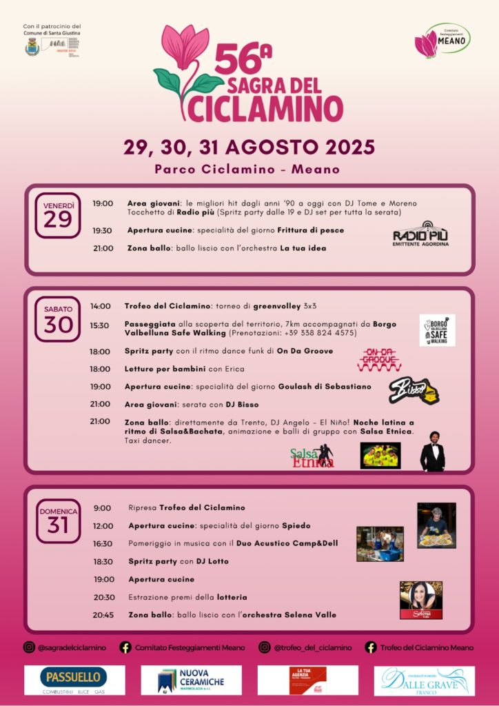 Dal 29 al 31 agosto il Parco Ciclamino di Meano ospiterà la 56ª edizione della Sagra del Ciclamino, organizzata dal Comitato Festeggiamenti con il patrocinio del Comune di Santa Giustina. Tre giorni di appuntamenti tra musica, sport, gastronomia e momenti dedicati a tutte le età.