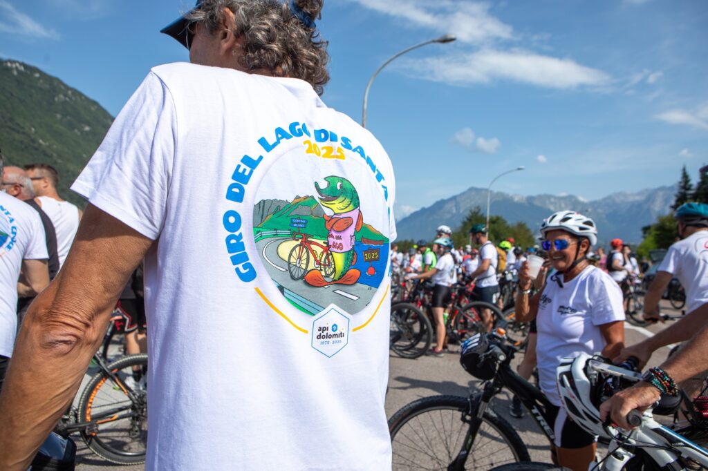 Come da tradizione, ogni iscritto ha ricevuto la maglietta celebrativa del Giro. Il disegno di quest’anno, firmato dal fumettista Alberto Levis, raffigura un luccio in bicicletta con lo sfondo del lago di Santa Croce e delle montagne bellunesi, insieme al logo di ApiDolomiti che festeggia i 50 anni di attività.