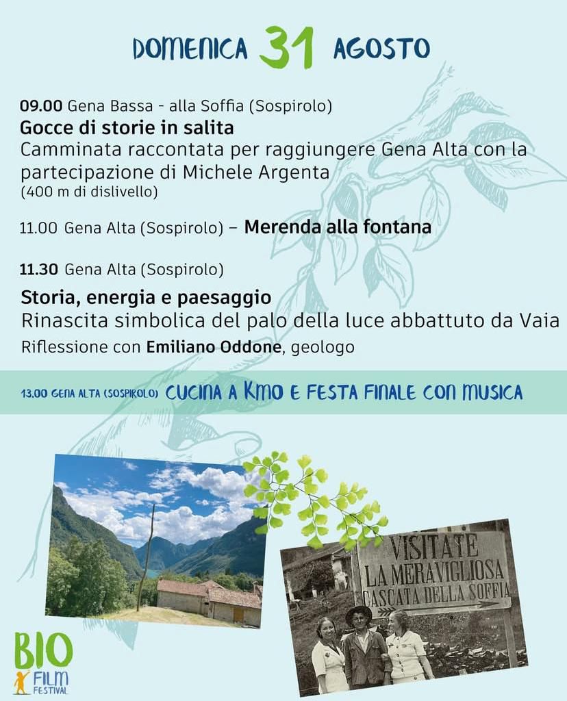 Non mancano infine le iniziative legate alla storia e alla vita delle comunità locali. Domenica 31 agosto è prevista la salita a Gena Alta con partenza da Gena Bassa alle 9, lungo strada e sentiero, con soste e racconti sulla memoria del luogo. Nel pomeriggio saranno proiettati i cortometraggi Ci son le stelle in Canal del Mis, dedicato alla storia locale, e A new word di Andrea Stomeo e Laure Keirouz, insieme ad altre opere. Sarà anche l’occasione per inaugurare i nuovi pannelli informativi sulla storia del Canal del Mis e di Gena.