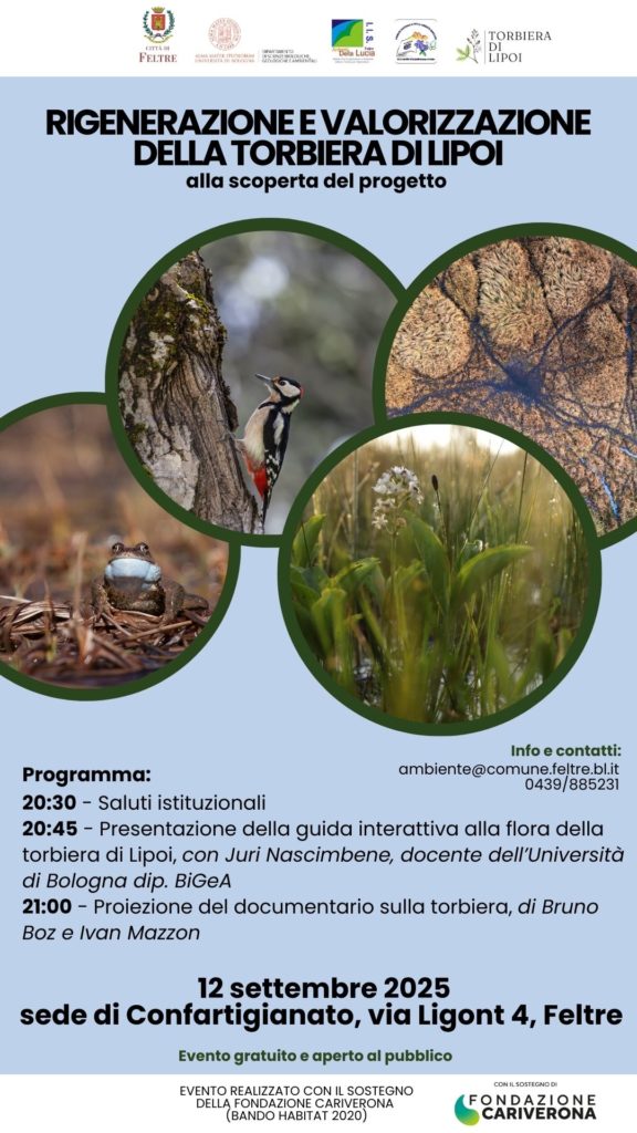 Il 12 settembre, alle 20.30 presso la sede di Confartigianato a Feltre, verranno presentati i risultati del progetto Rigenerazione e valorizzazione della torbiera di Lipoi. L’incontro prevede l’intervento di Juri Nascimbene dell’Università di Bologna e la proiezione di un documentario dedicato alla torbiera realizzato da Bruno Boz e Ivan Mazzon.