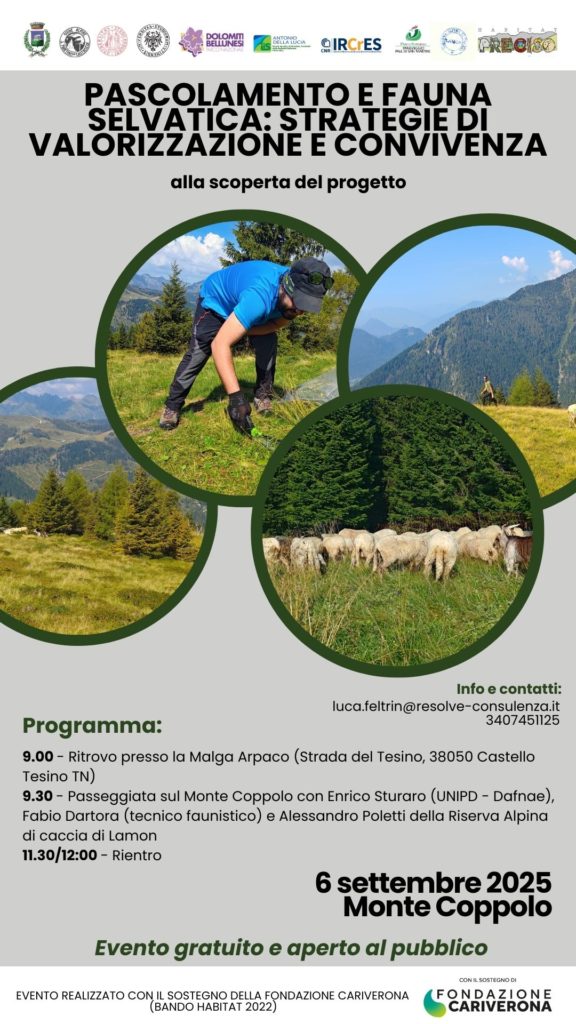 La rassegna è iniziata lo scorso 10 agosto a Sedico con l’incontro dedicato al progetto Villa Zuppani, la ricchezza della biodiversità. Il programma prosegue il 6 settembre con una passeggiata sul Monte Coppolo insieme agli esperti Enrico Sturaro dell’Università di Padova, Fabio Dartora, tecnico faunistico, e Alessandro Poletti della Riserva Alpina. L’iniziativa, con ritrovo alle ore 9.00 a Malga Arpaco (Castello Tesino, TN), sarà l’occasione per illustrare i risultati del progetto Pascolamento e fauna selvatica: strategie di valorizzazione e convivenza.