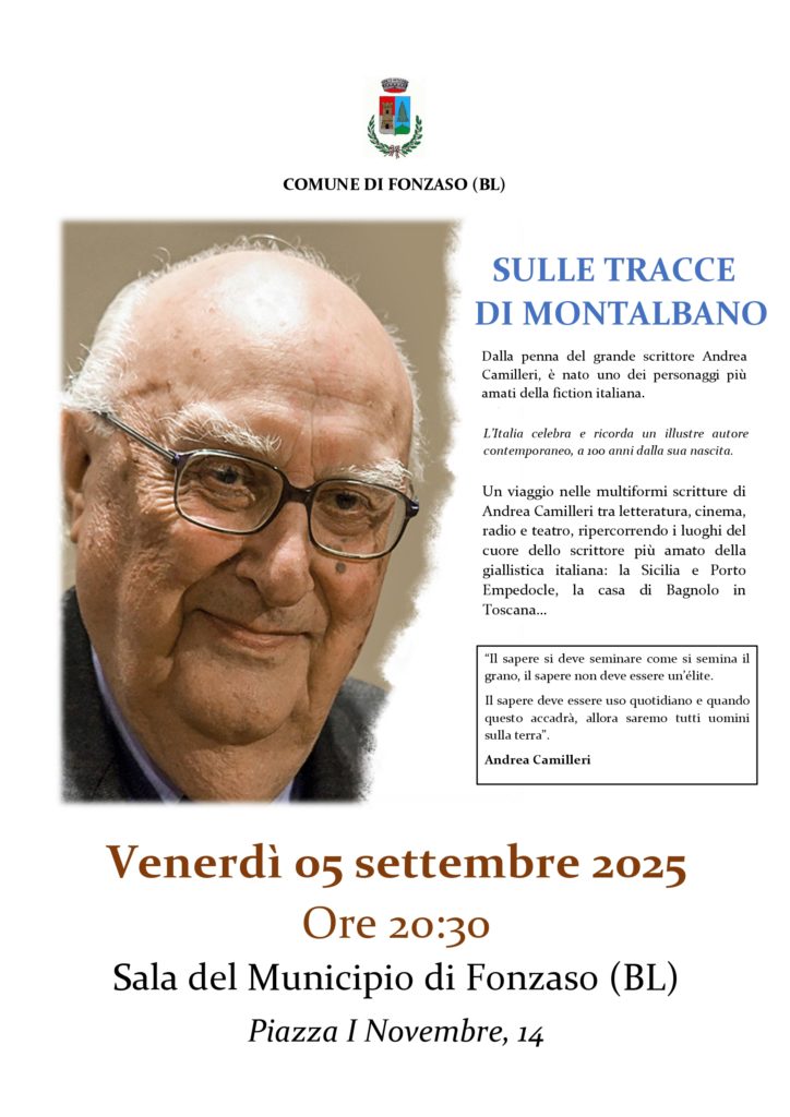 Il Comune di Fonzaso, attraverso la Biblioteca civica, organizza una serata dedicata allo scrittore siciliano, in programma venerdì 5 settembre 2025 alle 20.30 nella Sala del Municipio. L’iniziativa vuole essere un’occasione di riflessione su come le opere di Camilleri abbiano contribuito a dare nuova vitalità alla letteratura italiana, mantenendo al tempo stesso viva l’attenzione sulla Sicilia.