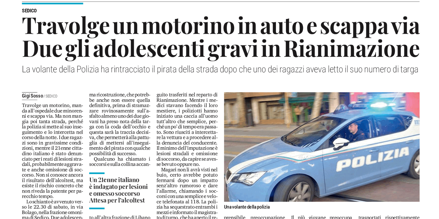 Due ragazzi minorenni in gravi condizioni all’ospedale, travolti sabato sera mentre viaggiavano in motorino da un giovane poco più grande di loro, rintracciato dalle forze dell’ordine e denunciato. È accaduto a Bolago di Sedico.