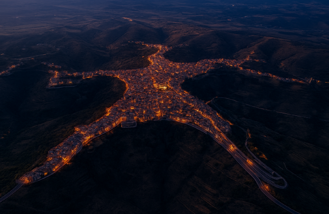 In contrapposizione, la People Strategy urbana e l’architettura gentile promuovono spazi orientati all’inclusione e alla relazione. Questa visione si ricollega all’intuizione dostoevskiana secondo cui “la bellezza salverà il mondo” (Fëdor M. Dostoevskij, L’idiota, 1869): la bellezza, intesa come dignità e giustizia, diventa principio generativo di convivenza e di rigenerazione sociale. In questa prospettiva, l’immagine dall’alto di Centuripe in Sicilia, con la sua forma stellata, assume un forte valore simbolico. L’insediamento, costruito intorno alle persone, richiama un modello urbano in cui lo spazio non divide ma unisce, creando identità condivisa e attrattività sociale.