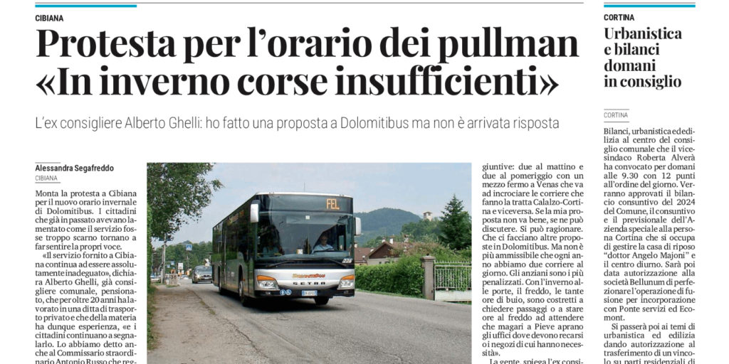 Cibiana di Cadore protesta, una corriera parte dal paese prima delle 7 del mattino, l’altra nel primo pomeriggio ma senza che poi esista un altro mezzo per tornare in paese. L’ex consigliere comunale ha scritto a Dolomiti Bus, nessuna risposta.