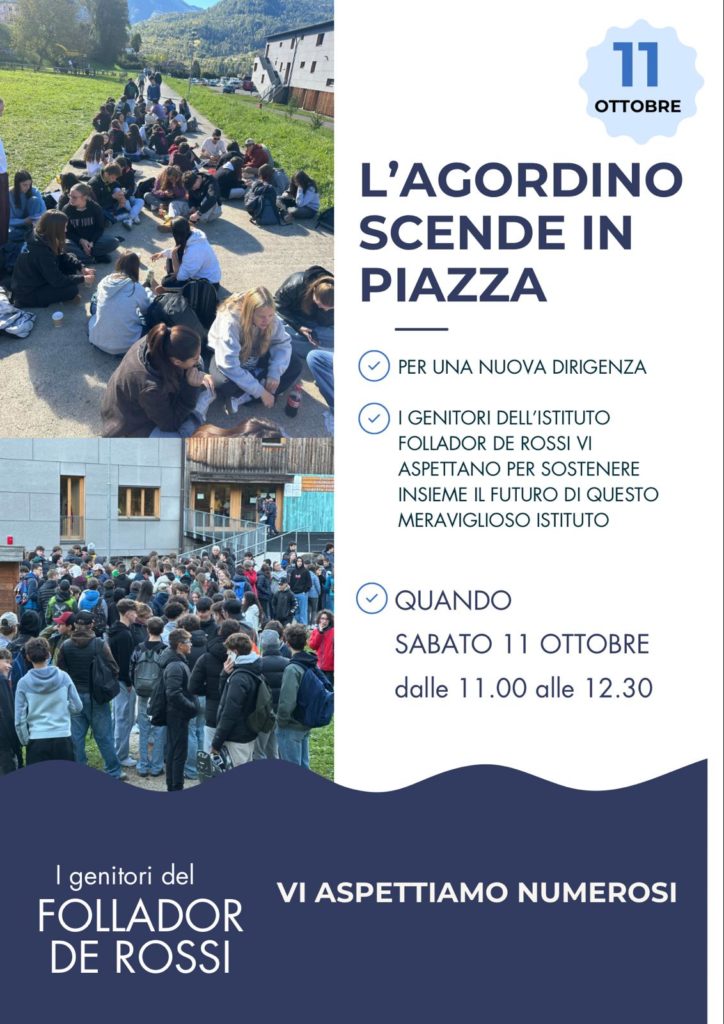 Inoltre sabato 11 ottobre, dalle 11.00 alle 12.30, scenderanno in piazza anche i genitori a protestare «per una nuova dirigenza», come scritto sulla locandina che sta circolando, invitando con loro l’Agordino «per sostenere insieme il futuro di questo meraviglioso istituto».