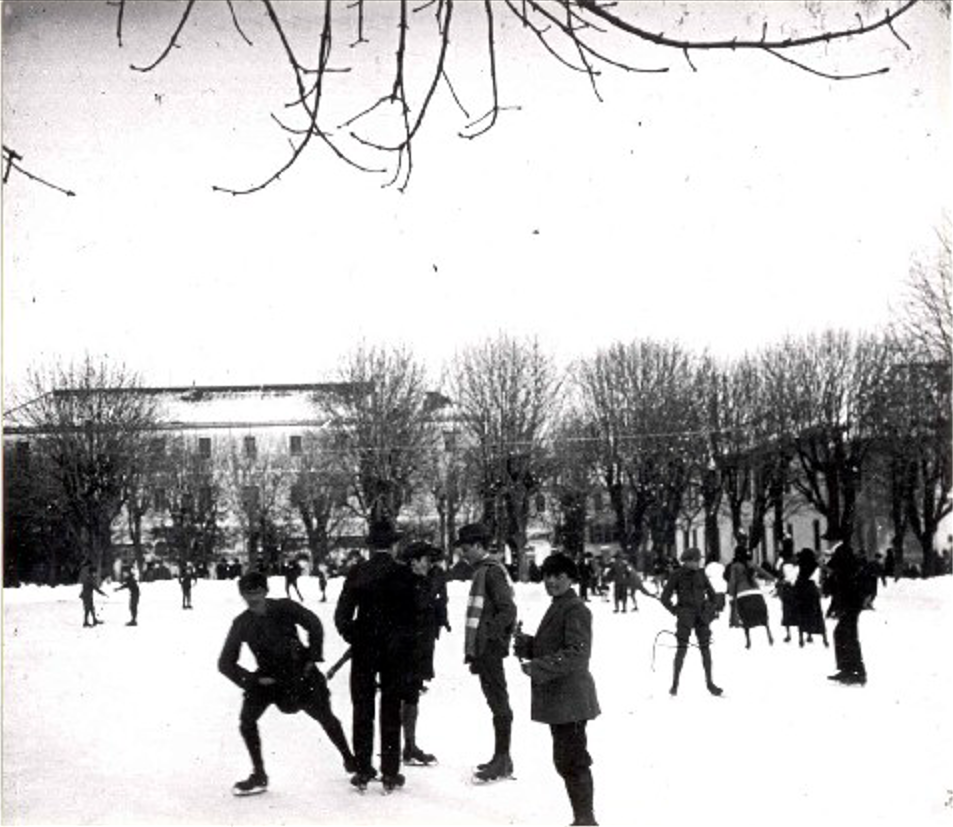 L’area del Parco rappresentava, nel Settecento, l’orto giardino del Palazzo dei Gesuiti. L’adattamento a spazio comunale è ottocentesco e, dai primi dello scorso secolo3 sicuramente ha ospitato molti sport ed attività ludiche: dal pattinaggio su ghiaccio, alla ginnastica collettiva sollecitata dal Duce, al gioco col pallone, al tennis. La serie di immagini recuperate illustra bene questo percorso.