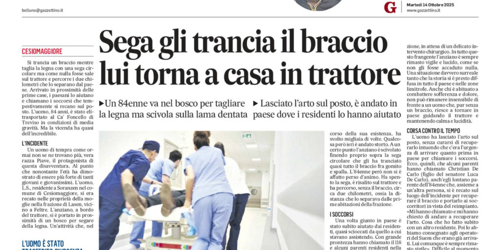 La vicenda ha dell’incredibile: a Cesiomaggiore un uomo di 84 anni si è fatto male mentre segava la legna nel bosco, ha avuto il braccio tranciato – riferisce il Gazzettino – e senza l’arto è salito in trattore, ha percorso due chilometri e si è fatto aiutare dai paesani. È a Treviso, in condizioni di media gravità.