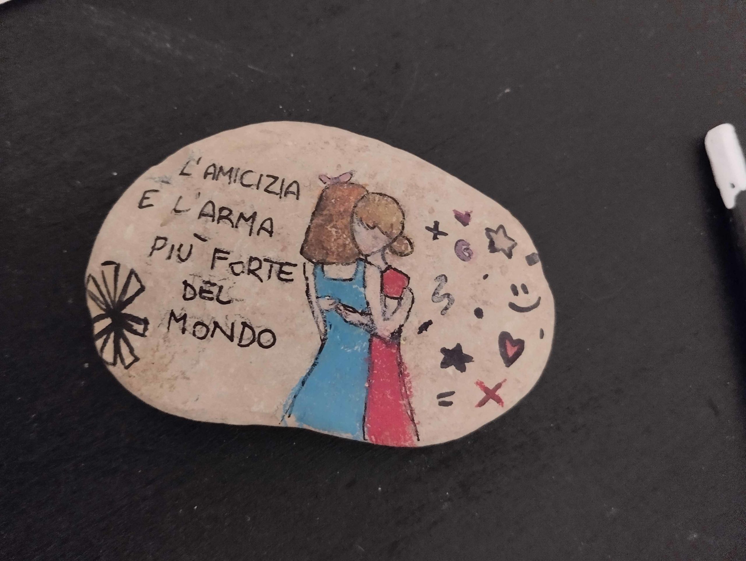 «Vista l’atmosfera pesante che si respira a causa della situazione mondiale – spiega l’insegnante – e soprattutto ascoltando le domande e le preoccupazioni dei ragazzi, ho voluto dare loro la possibilità di far sentire la propria voce. Alcuni mi hanno detto che gli adulti possono scioperare o manifestare, mentre loro, essendo piccoli, non possono fare nulla. Da qui è nata l’idea: come potevano anche loro esprimersi?». Così, in classe, i ragazzi hanno cominciato a riflettere e a raccogliere parole legate ai concetti di pace e di guerra, realizzando prima un grande cartellone collettivo. Poi, ognuno ha scelto un sasso – quello che più lo ispirava – e lo ha dipinto con un disegno o un simbolo di pace.