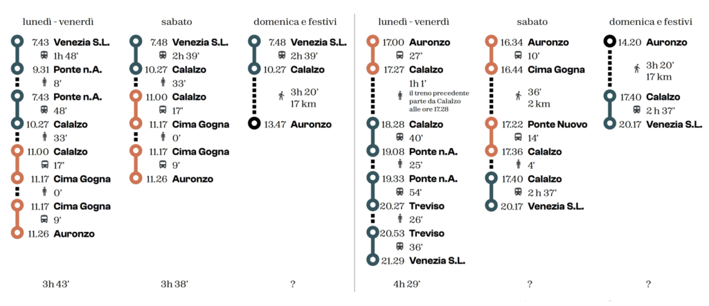 Nella tabella qui sopra cercate gli omini e gustatevi l’amara ironia di TreniBelluno.it: nelle ‘‘coincidenze’’ tra Venezia e Auronzo di Cadore occorre prevedere, oltre ai lunghi tempi di attesa (omino fermo) anche qualche buona ora di… passeggiata. Càpita nel 2025. A collegare due siti Unesco.