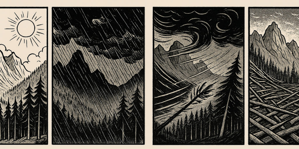 La tempesta Vaia si verifica a fine ottobre 2018. Dopo giornate di caldo anomalo, con temperature su valori estivi anche superiori ai 30°, venerdì 26 ottobre il tempo inizia a cambiare e si annuncia l’arrivo di una forte perturbazione, con venti di favonio. Sabato 27 ottobre cominciano le precipitazioni e si fanno torrenziali, con imponenti accumuli in poche ore; si verificano le prime frane ed esondazioni. Nel tardo pomeriggio di domenica 28 le precipitazioni sembrano placasi. Ma il culmine della tempesta Vaia arriva nel pomeriggio e soprattutto la sera di lunedì 29: le piogge raggiungono il culmine, con venti di scirocco che sfiorano i 200 km all’ora; si verificano enormi frane e smottamenti, il sistema idrogeologico della provincia di Belluno viene profondamente segnato e altrettanto accade alle aree boscate, con milioni di alberi abbattuti in provincia di Belluno.