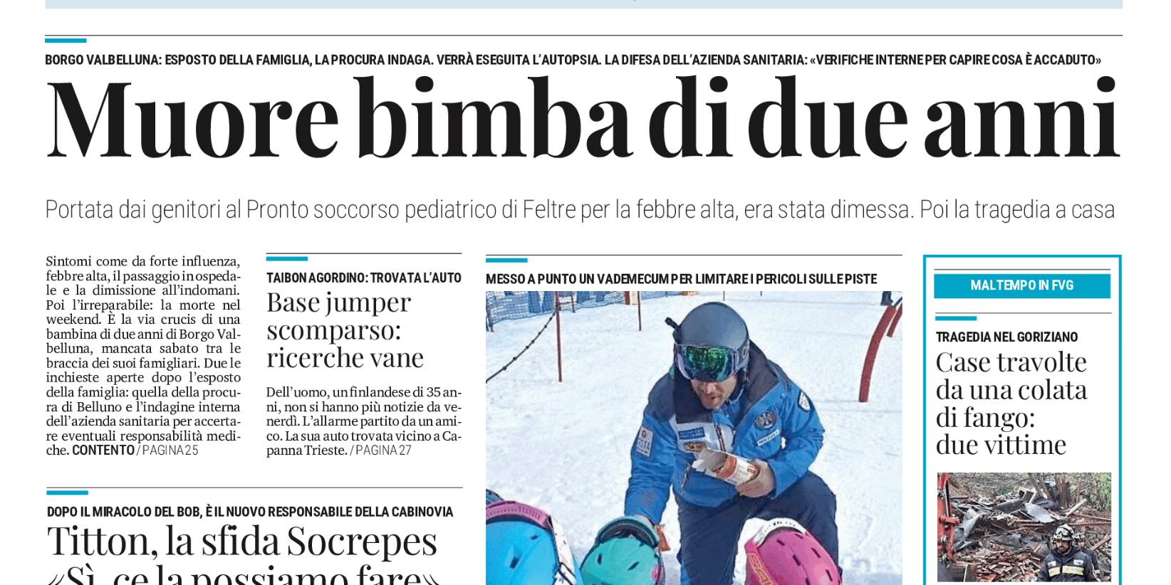 Due indagini sono state aperte, una interna all’ospedale di Feltre, voluta dall’Ulss, una della Procura: va accertato se Ludovica, la bimba di Mel morta sabato a soli due anni, poteva essere salvata. Il giorno prima era stata portata al Santa Maria del Prato, era stata vista dai pediatri ed era stata rimandata a casa con le indicazioni che sembravano sufficienti per farla guarire dai forti sintomi influenzali. Invece poi è avvenuto il drammatico epilogo.