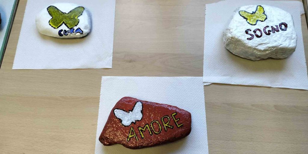 Una trentina di piccoli sassi colorati, ciascuno con una parola «gentile e illuminante», spiega De Battista, «che vuole richiamare l’attenzione dei passanti e far fiorire nel loro animo sentimenti positivi e di speranza, per far nascere il desiderio di ritrovare il senso profondo del vivere».