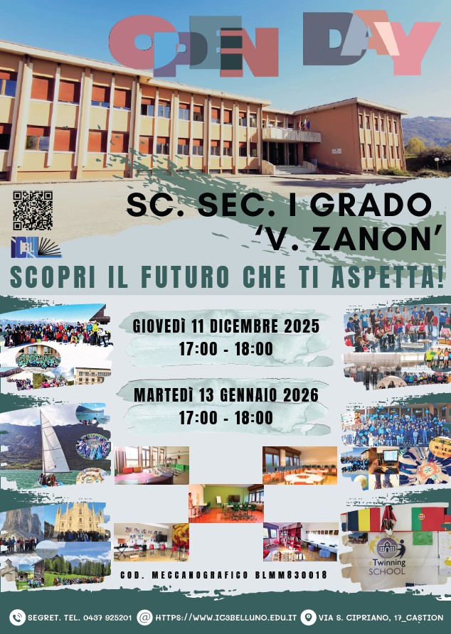 La scuola secondaria di primo grado “Zanon”, appartenente all’Istituto comprensivo Belluno 3, si prepara ad accogliere famiglie e studenti in vista delle prossime iscrizioni. Le giornate di open day sono fissate per giovedì 11 dicembre e martedì 13 gennaio, entrambe dalle 17 alle 18.