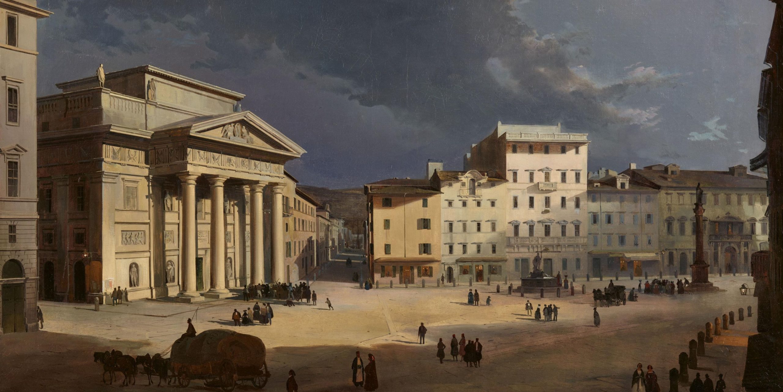 Caffi per avere questa visuale ottimale della piazza molto probabilmente si posizionò presso una finestra al primo o secondo piano della casa situata al numero civico 4 e da lì riuscì a cogliere il palazzo della Borsa con suo colonnato classicheggiante e, d’infilata, la via Cassa di Risparmio. Il dipinto è prezioso anche perché ci mostra come questi importanti edifici triestini si presentassero nel 1840, prima di subire le tante modifiche che li portarono alla situazione attuale.