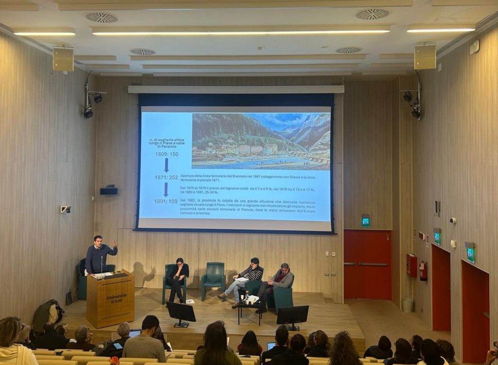 Questo il commento di Mauro Pascolini, già presidente di Rete Montagna e geografo dell’Univ. di Udine: «Troppo spesso la montagna viene vista come un territorio non economicamente produttivo se non solamente in chiave turistica. La montagna da sempre invece è al centro di una fitta rete di relazioni e di traffici non solo intervallivi, ma pure e spesso, in chiave determinante, con la pianura e con i centri forti del fondovalle e del pedemonte, con un intelligente uso delle risorse agrosilvopastorali accompagnato dalla produzione di prodotti legati alla trasformazione delle materie prime o alla innovazione tecnologica. Ne sono un esempio nelle Alpi Orientali l’occhialeria nel Bellunese o l’arte tessile in Carnia, solo per citarne due dei tanti che si potrebbero indicare. E oggi alcune iniziative nelle aree, come quella delle montagne friulane e bellunesi, non del tutto colonizzate dalla monocoltura turistica, stanno offrendo nuovi interessanti esempi legati alle potenzialità del digitale e del lavoro a distanza. Negli interventi e nel dibattito si è sviluppato un percorso che ha analizzato sia la situazione del passato, con l’intervento dello storico Giacomo Bonan, che ha analizzato il ruolo della risorsa legno nella transizione forestale tra Otto e Novecento mettendo in luce l’evoluzione delle pratiche del passato, come la fluitazione lungo la Piave, e dimostrando come ancor oggi il legno sia una risorsa fondamentale per la montagna. Viviana Ferrario, geografa IUAV, ha descritto la situazione dell’agricoltura, in particolare nelle Alpi Orientali, con alcuni casi studio in Comelico, Val Belluna, Canal del Ferro e Val Canale, mettendo in luce i nuovi trend che giovani agricoltori stanno mettendo in essere e come cambiamento climatico stia modificando sia i modelli colturali che l’altimetria delle coltivazioni, in particolare della vite. Il ricercatore EURAC Philipp Corradini e il prof. Alberto Bramanti dell’UniMi, hanno invece portato esempi di un turismo sostenibile ed il quadro emerso è quello di una montagna vitale, che, specie nelle aree più periferiche, sta perseguendo nuovi percorsi di sviluppo, dimostrando di essere produttiva e luogo di sperimentazione di nuove economie».