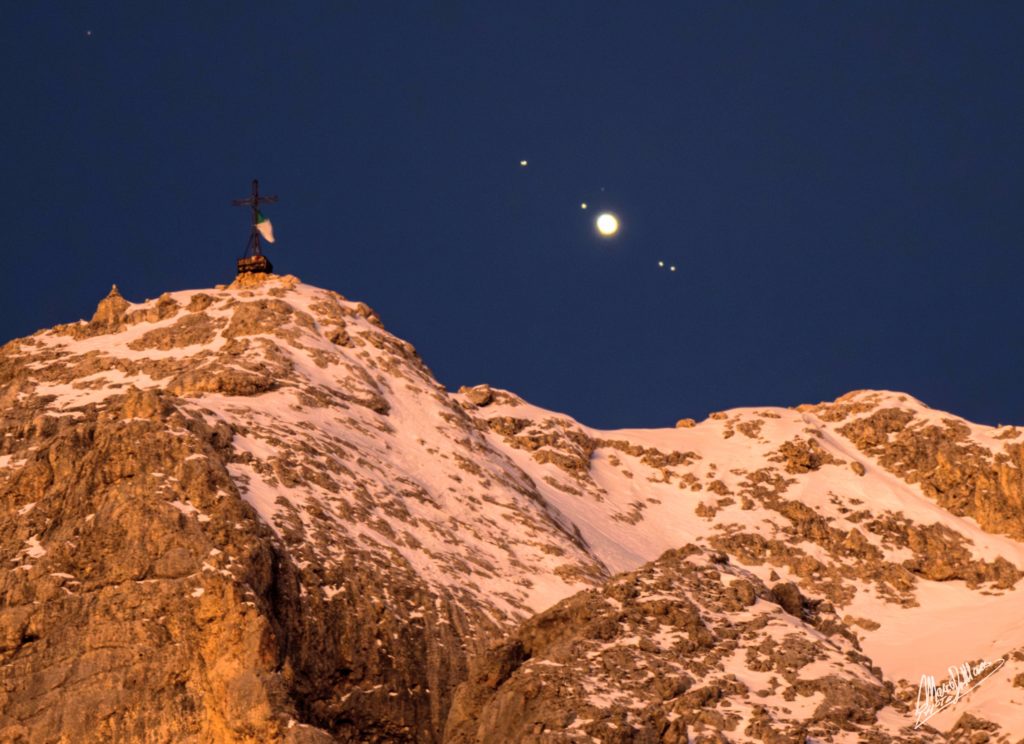 Le fotografie sono state eseguite da Voltago Agordino intorno alle ore 7, utilizzando un teleobiettivo da 800 millimetri. La particolarità della scena è legata alla visibilità simultanea del pianeta e delle sue lune, ancora illuminate dal sole, mentre le Dolomiti assumono tonalità dorate che incorniciano l’insieme.