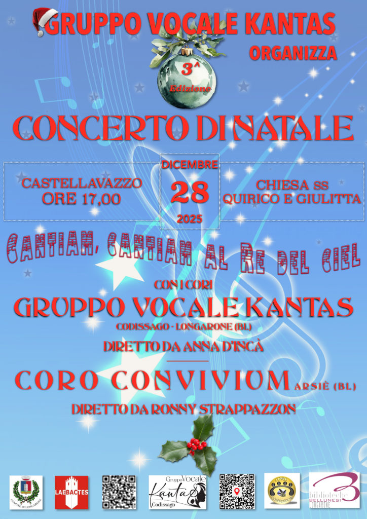 Si terrà domenica 28 dicembre alle 17, nella chiesa di Castellavazzo, la terza edizione del Concerto di Natale organizzato dal Gruppo vocale Kantas. L’appuntamento musicale rientra nel percorso di iniziative che il coro propone nel periodo delle festività.