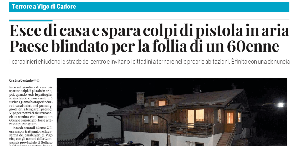 Esce nel giardino di casa per sparare colpi di pistola in aria, poi, quando vede le pattuglie, si rinchiude e non vuole più uscire. Quanto basta per indurre i carabinieri, nel pomeriggio di ieri, a blindare il paese di Vigo per motivi di sicurezza sociale: sembra che l’uomo, un 60enne conosciuto, fosse alterato al punto giusto. In tarda serata il 60enne Z.F. era ancora trattenuto nella caserma dei carabinieri di Vigo che, con gli uomini della Compagnia provinciale di Belluno e del reparto operativo, hanno preso in mano la situazione chiudendola senza alcun ferito.