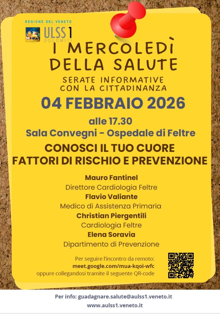 Il prossimo appuntamento è in programma per mercoledì 4 febbraio 2026 alle 17.30, nella sala convegni dell’ospedale di Feltre, ed è dedicato alla salute cardiovascolare. L’incontro, intitolato “Conosci il tuo cuore: fattori di rischio e prevenzione”, sarà l’occasione per affrontare, insieme a diversi professionisti, i principali aspetti legati alla prevenzione delle malattie del cuore.