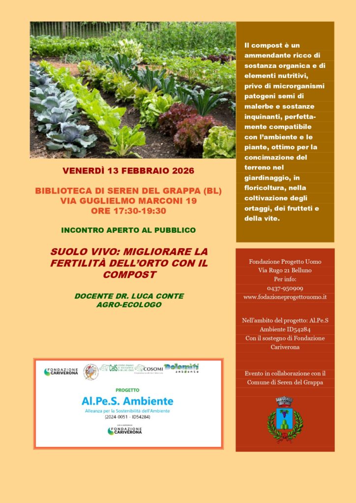 Si terrà venerdì 13 febbraio 2026, dalle 17.30 alle 19.30, nella biblioteca di Seren del Grappa in via Guglielmo Marconi 19, l’incontro pubblico intitolato “Suolo vivo: migliorare la fertilità dell’orto con il compost”. L’appuntamento mira a offrire a cittadini e orticoltori alcuni strumenti per comprendere meglio il funzionamento del suolo e come mantenerlo fertile in modo naturale.