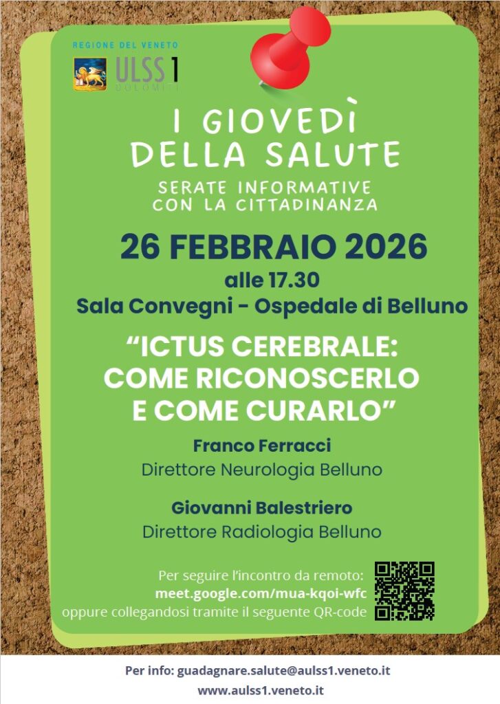 Il prossimo appuntamento è in programma giovedì 26 febbraio 2026 alle 17.30, nella sala convegni dell’ospedale di Belluno. L’incontro, dal titolo «Ictus cerebrale: come riconoscerlo e come curarlo», sarà dedicato a una patologia per la quale la tempestività dell’intervento risulta determinante. A intervenire saranno Franco Ferracci, direttore della Neurologia di Belluno, e Giovanni Balestriero, direttore della Radiologia di Belluno. Nel corso del pomeriggio verranno illustrate le modalità per riconoscere rapidamente i sintomi dell’ictus e i percorsi di cura attualmente adottati.
