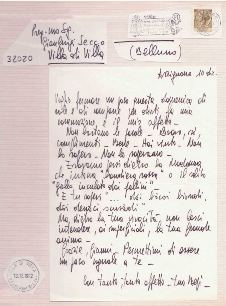 [32] La lettera mi è arrivata inaspettata; probabilmente il Bepi ha letto la nuova del Premio e si è ricordata la poesia recitata, credo, a Bologna, circa un mese prima, quando eravamo assieme.