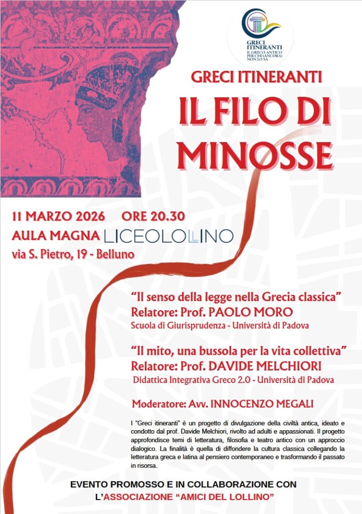 Mercoledì 11 marzo, alle 20.30, l’Aula Magna del Liceo ospiterà l’incontro intitolato “Il filo di Minosse”, iniziativa che rientra nel progetto “Greci itineranti — Il greco antico per chi (ancora) non lo sa”, promosso da Davide Melchiori, docente di Didattica integrativa Greco all’Università di Padova. Si tratta di un percorso formativo avviato a inizio anno scolastico, già accompagnato da lezioni rivolte agli studenti del Liceo Lollino.