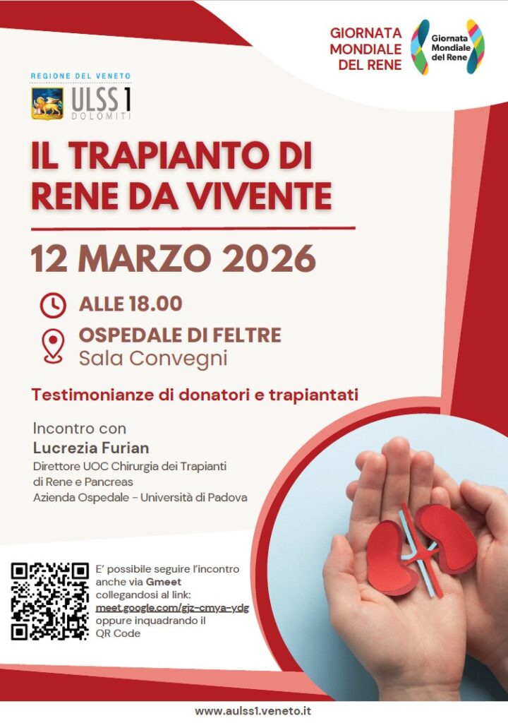 L’appuntamento, dal titolo «Il trapianto di rene da vivente», è in programma il 12 marzo 2026 alle 18.00 nella sala convegni dell’ospedale di Feltre. All’incontro interverrà Lucrezia Furian, direttrice dell’Uoc Chirurgia dei Trapianti di Rene e Pancreas dell’Azienda Ospedale – Università di Padova, che illustrerà vari aspetti clinici e organizzativi del trapianto.