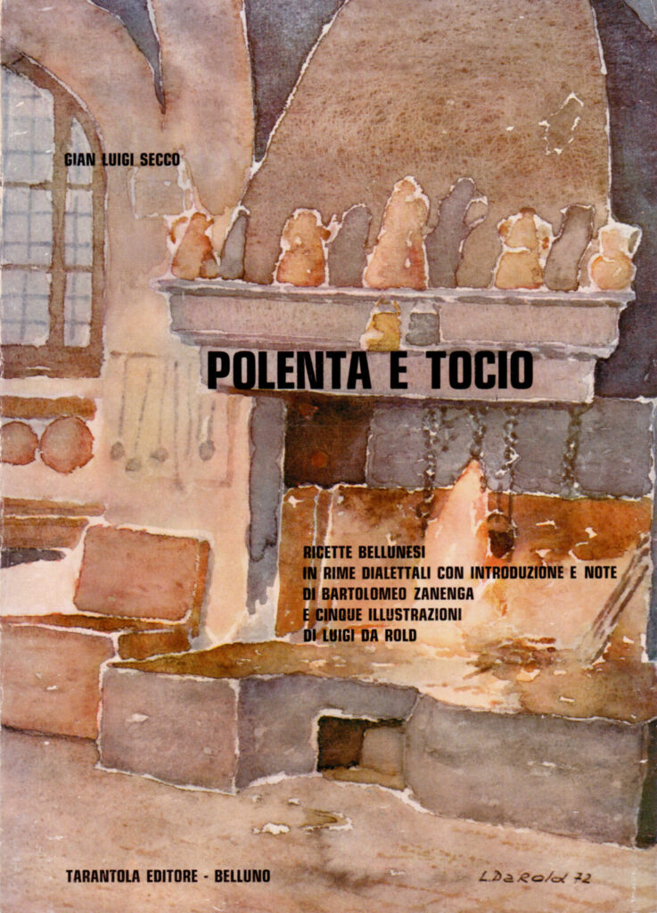 [3] Gianluigi Secco, Polenta e tòcio, ricette bellunesi in versi dialettali con introduzione storica di Bartolomeo Zanenga e acquerelli di Luigi da Rold (182 pp., 17×24 cm), Tarantola Editore, Belluno, 1972.