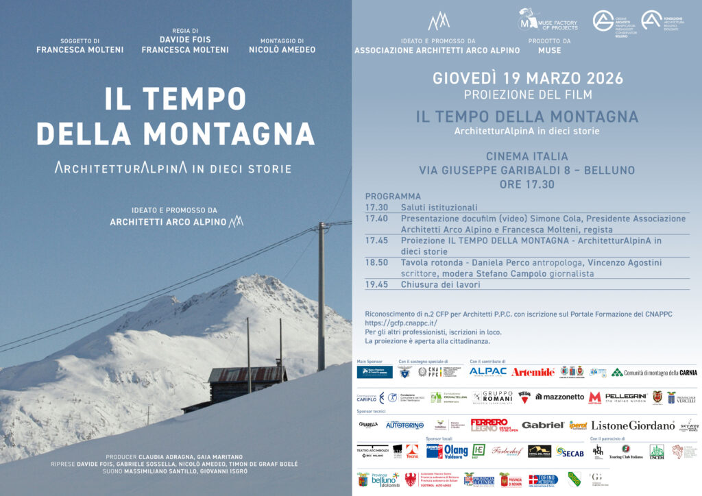 Ha debuttato a Milano il 5 marzo scorso Il tempo della montagna – Architetturalpina in dieci storie, il primo progetto cinematografico interamente dedicato all’architettura contemporanea nelle Alpi italiane. Il film nasce da un’idea dell’Associazione Architetti Arco Alpino, di cui fa parte anche l’Ordine degli Architetti della Provincia di Belluno, ed è prodotto da Muse Factory of Projects per la regia di Francesca Molteni e Davide Fois.