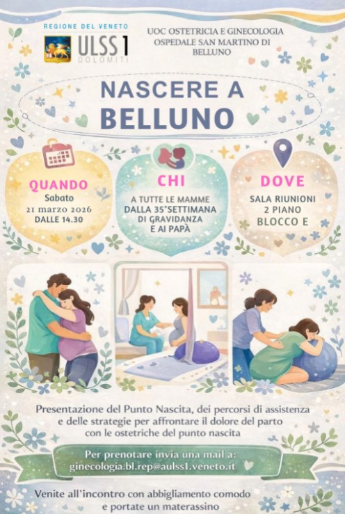 Il prossimo appuntamento è in programma per sabato 21 marzo 2026 alle 14.30, nella sala riunioni dell’ospedale San Martino di Belluno (secondo piano, blocco E). L’incontro è rivolto alle mamme dalla 35ª settimana di gravidanza e ai papà e prevede un momento di confronto con le ostetriche, durante il quale saranno presentati il punto nascita e i percorsi di assistenza.