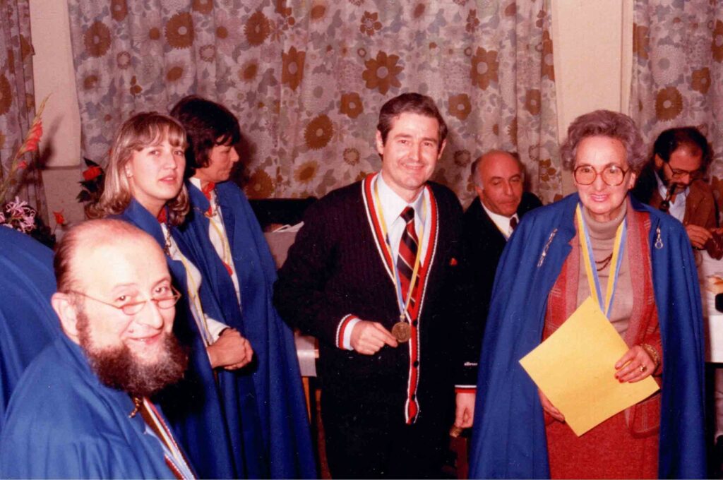 [4] Col medesimo disegno fu realizzata, negli anni Ottanta, la matrice per coniare la medaglia di bronzo usata per l’intronazione dei nuovi confratelli. Da allora Franco Fiabane si è reso disponibile ad aiutare con la sua opera, specialmente tramite la grafica, Associazioni o Autori in occasione di nuove opere, anniversari e altre occasioni celebrative con una generosa attività che dura ormai ininterrotta da quasi quarant’anni e che sarebbe interessante precisamente documentare.