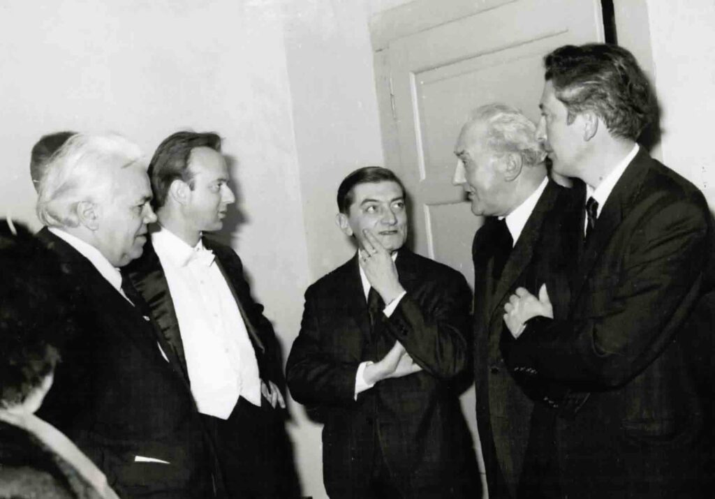 Al centro Giano Perale con Nino Prosdocimi e Italo Pradella sulla destra mentre gli altri sono il direttore e alcuni orchestrali dell’Orchestra da Camera di Sofia, invitata a suonare a Belluno.