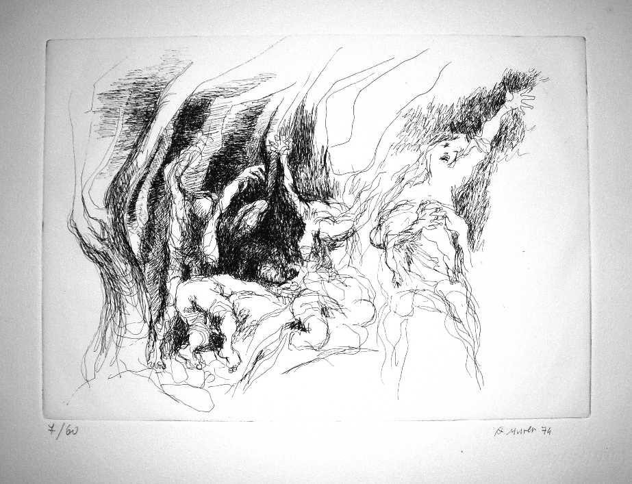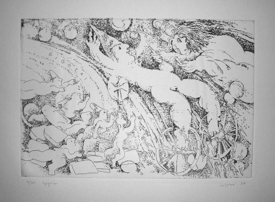 Nel ’74 ho prodotto una cartella con cinque poesie interpretate ad acqueforte da Vico Calabrò (Gigolai), Giuliano De Rocco (Pescadori), Bruno Milano (Puglia), Augusto Murer (Auswiz) e Claudio Nevyjel (Par la mort de n bocia).
