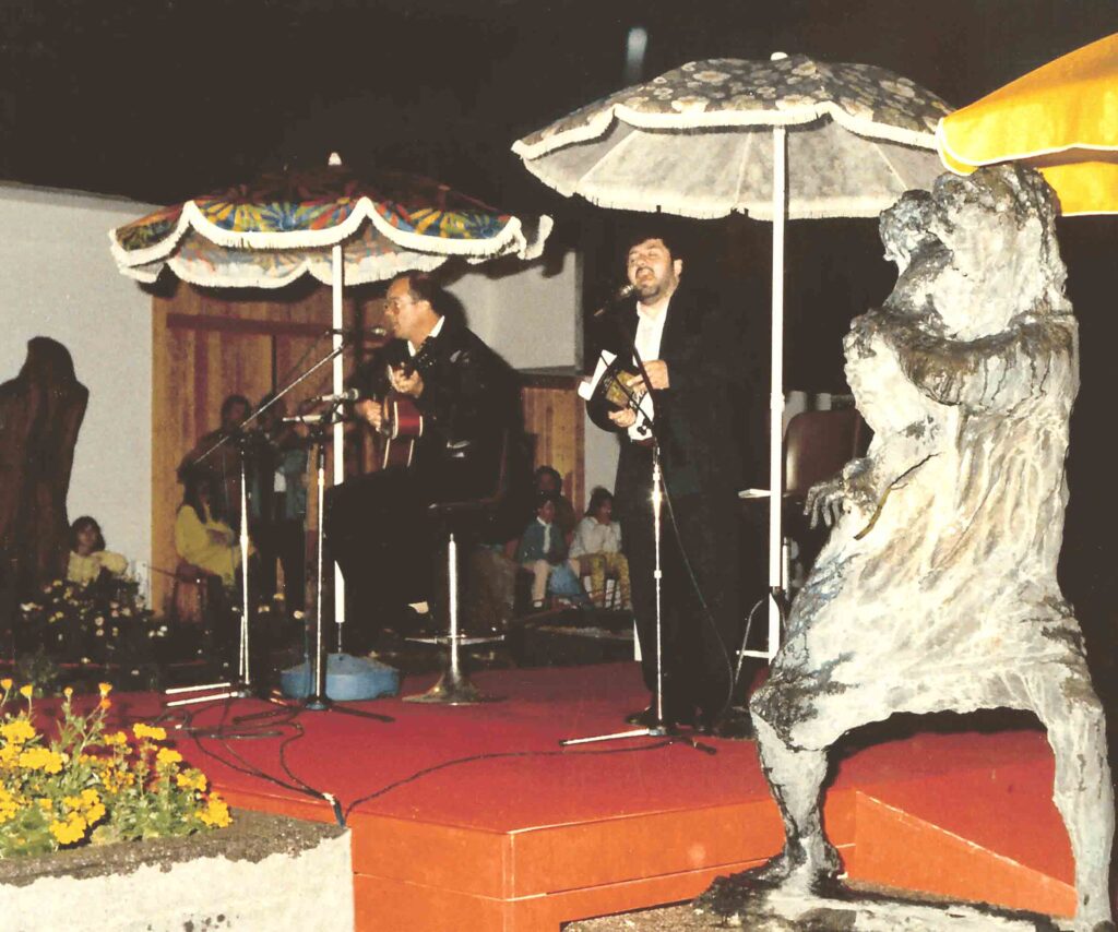 Quella sera il tema era l’emigrazione e l’ambiente sembrava magico. Augusto se ne stava defilato, guardando lo spettacolo di sghimbescio, rannicchiato dietro un bronzo, in controluce, con l’immancabile maglione nero a coste col girocollo alto, statua nella statua. Ad un certo punto un temporale estivo ci assalì (era tutto il pomeriggio che girava). Qualcuno ci coprì con due ombrelloni da spiaggia[10] e spuntarono presto parapioggia qua e là fino a coprire il tratto del prato fino ai pini con un inverosimile mosaico di colori. Lo spettacolo continuò sotto l’acqua per almeno una decina di minuti, con il pubblico intento, senza un segno d’impazienza, come incantato. Alla fine Augusto mi disse di non aver mai visto una cosa del genere.