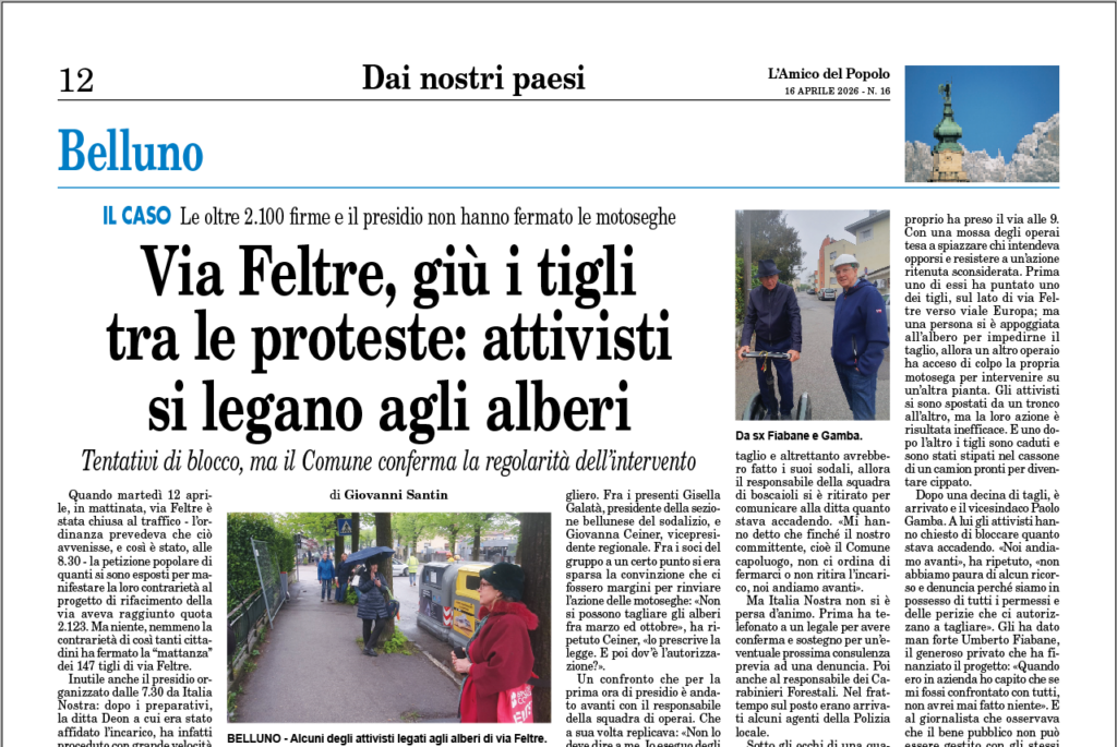C’è un nuovo Amico. Sul numero 16 dell’Amico del Popolo di carta del 16 aprile 2026, distribuito questa settimana (in abbonamento tradizionale, in edizione digitale e in edicola), puoi leggere per intero l’articolo sull’abbattimento dei tigli in via Feltre a Belluno. Acquista e sfoglia L’Amico del Popolo classico, non perderti il piacere delle notizie impaginate, della grafica, delle evidenze. Chiedi info a segreteria@amicodelpopolo.it