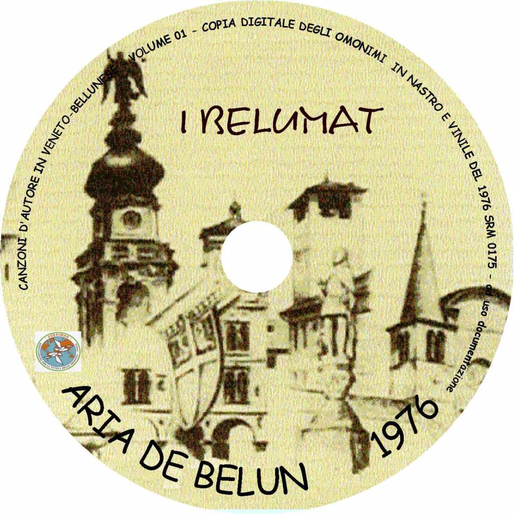 Se ne trasmisero, con ottimo esito, 14 puntate[7], che erano condite anche con le nostre canzoni. Visto l’esito e la sempre maggior richiesta di serate culturali da fare in teatro[8], ci sembrò opportuno fare un nuovo passo: realizzare il primo long playing dei Belumat, cui demmo il nome della fortunata radiorubrica Aria de Belun[9], e che riuniva in parte le canzoni di A pas da zìnghen e altre nuove nate nel frattempo.