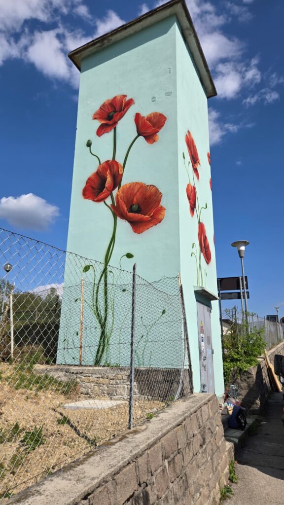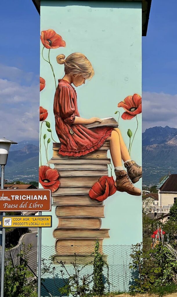 A Trichiana, nel comune di Borgo Valbelluna, lungo la strada che conduce a Sant’Antonio, una nuova opera di street art cattura da alcuni giorni lo sguardo dei passanti. Il dipinto, realizzato su una cabina elettrica, raffigura una bambina seduta su una pila di libri, immersa nella lettura, mentre attorno a lei sbocciano papaveri rossi che riempiono la scena con un forte impatto visivo ed emotivo.