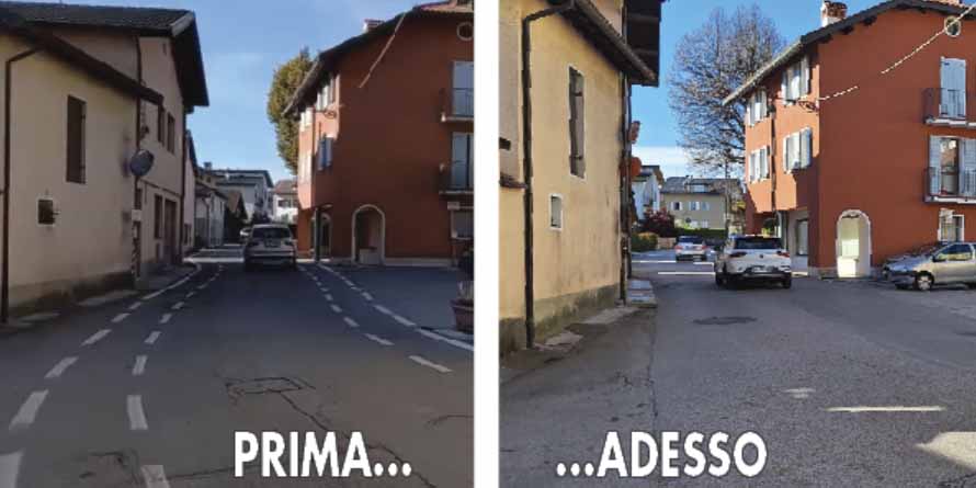 Nella foto la situazione a Nogaré, dove la segnaletica orizzontale che indica la corsia ciclabile è del tutto stinta e non ripristinata
