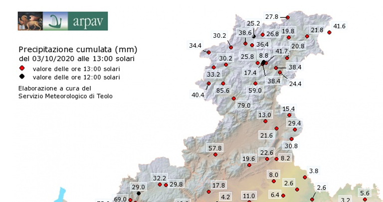 Le piogge più abbondanti su basso Agordino, basso Zoldano e Feltrino