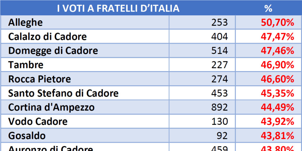Il record è ad Alleghe: il partito di Giorgia Meloni sfonda la soglia del 50%